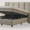 Onder het verfijnde geheel bevindt zich een solide metalen frame met ruime, discreet weggewerkte opbergruimtes. Dankzij het soepel scharnierende liftsysteem kan beddengoed, textiel of seizoensartikelen moeiteloos worden opgeborgen — een praktische luxe die in premium slaapkamers niet mag ontbreken.