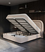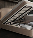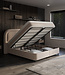 Onder de boxspring bevindt zich een royale opbergruimte met metalen frame, bereikbaar via een voorwaartse opening. Vier krachtige gasveren (1000N) zorgen voor soepel openen en sluiten. Ideaal voor het netjes opbergen van bedtextiel, kleding of koffers. Dankzij de matzwarte poten van 12 cm oogt het geheel luchtig en modern.