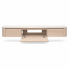 Ontdek onze Japandi TV-meubels in licht beige eiken en walnoot travertine blad.