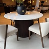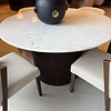 Het onderstel, gemaakt van donker walnootbruin geribbeld hout, biedt niet alleen een stevige basis maar voegt ook een warme, luxe sfeer toe. De fijne ribbelstructuur geeft een modern en stijlvol effect, wat deze tafel een ware eyecatcher maakt in ieder interieur.