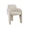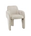 De stoel is bekleed met een rijke beige bouclé-stof die niet alleen visueel warmte toevoegt, maar ook een uitzonderlijk aangenaam zitcomfort biedt. De subtiele textuur vangt het licht op een elegante manier en versterkt het luxueuze karakter van het ontwerp. De licht gebogen armleuningen en ergonomisch gevormde rugleuning zorgen voor een comfortabele, ondersteunende zitervaring.
